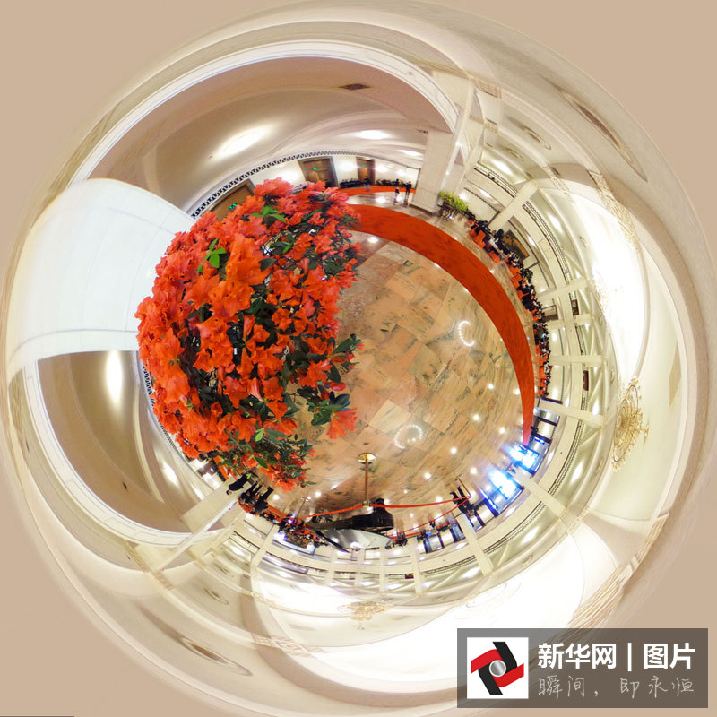 ??? 兩會(huì)期間,人民大會(huì)堂里溫暖如春,杜鵑花、迎春花等春花競(jìng)相開(kāi)放,記者用360度球形全景的特殊視角展現(xiàn)人民大會(huì)堂里春花開(kāi)放的美景。圖片來(lái)源:視覺(jué)中國(guó)
