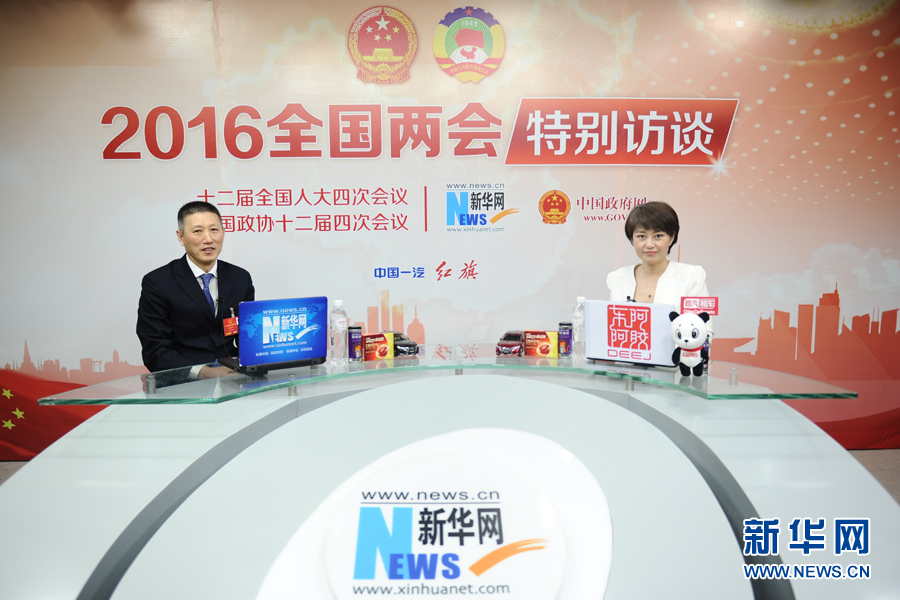 ??? 2016年3月13日,全國人大代表,煙臺張裕葡萄釀酒股份有限公司總經(jīng)理周洪江做客新華網(wǎng)兩會訪談。圖為周洪江在訪談現(xiàn)場。新華網(wǎng) 盧志佳 攝