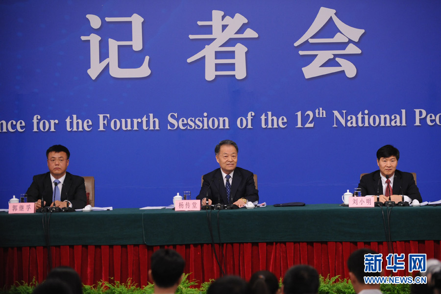 十二屆全國(guó)人大四次會(huì)議新聞中心于3月14日(星期一)10時(shí)在梅地亞中心多功能廳舉行記者會(huì),邀請(qǐng)交通運(yùn)輸部部長(zhǎng)楊傳堂、交通運(yùn)輸部運(yùn)輸服務(wù)司司長(zhǎng)劉小明、北京交通發(fā)展研究中心主任郭繼孚就“深化出租汽車(chē)改革與發(fā)展”的相關(guān)問(wèn)題回答中外記者的提問(wèn)。圖為記者會(huì)主席臺(tái)。新華網(wǎng)/中國(guó)政府網(wǎng) 陳杰 攝