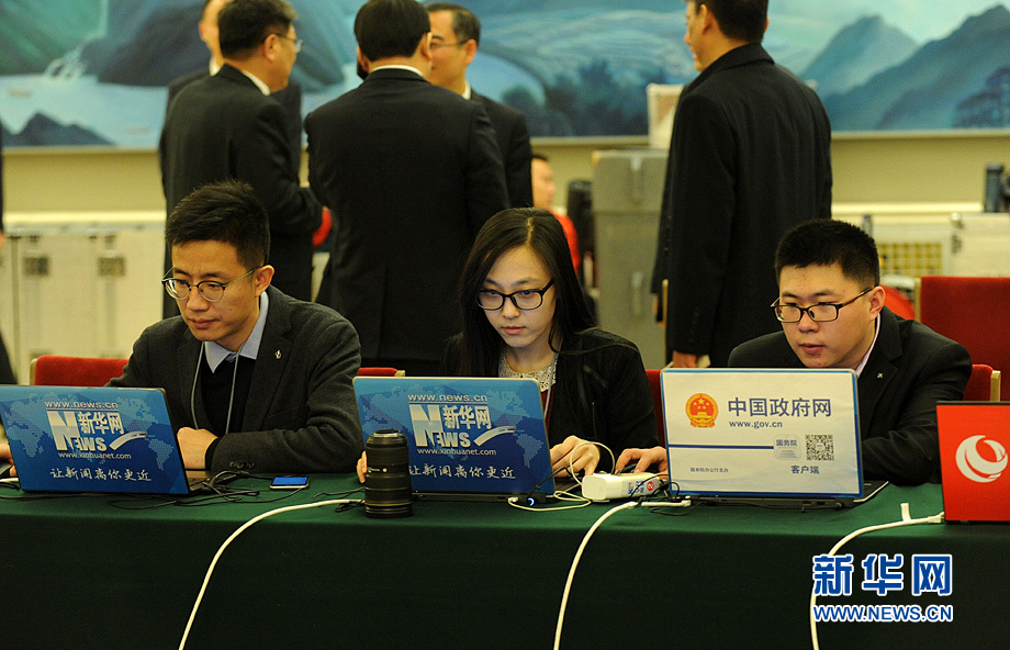 3月16日上午,國務院總理李克強在人民大會堂三樓金色大廳會見采訪十二屆全國人大四次會議的中外記者并回答記者提出的問題。圖為新華網(wǎng)、中國政府網(wǎng)記者在做直播準備。新華網(wǎng)/中國政府網(wǎng) 陳競超 攝