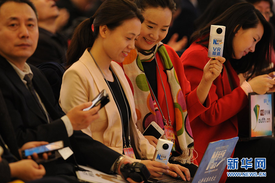 3月16日上午,國務(wù)院總理李克強(qiáng)在人民大會(huì)堂三樓金色大廳會(huì)見采訪十二屆全國人大四次會(huì)議的中外記者并回答記者提出的問題。圖為新華網(wǎng)記者用VR報(bào)道總理記者會(huì)現(xiàn)場。新華網(wǎng)/中國政府網(wǎng) 陳杰攝