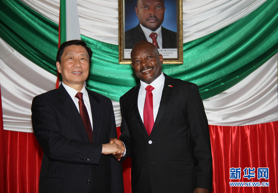 ??? 5月11日,布隆迪總統(tǒng)恩庫倫齊扎(右)在布瓊布拉會見到訪的中國國家副主席李源潮。新華社記者呂天然攝