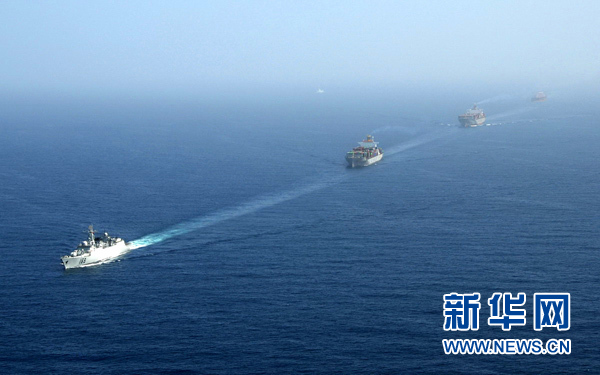 2009年1月6日,在中國(guó)海軍護(hù)航艦艇編隊(duì)武漢號(hào)導(dǎo)彈驅(qū)逐艦的帶領(lǐng)下,被護(hù)航的中國(guó)商船一字排開(kāi)航行。 2009年4月28日,中國(guó)人民解放軍海軍第一批赴亞丁灣護(hù)航編隊(duì),圓滿完成護(hù)航任務(wù)后返回海南三亞某軍港。由武漢號(hào)導(dǎo)彈驅(qū)逐艦、??谔?hào)導(dǎo)彈驅(qū)逐艦和微山湖號(hào)綜合補(bǔ)給艦組成的海軍首批護(hù)航編隊(duì),在124個(gè)日夜里連續(xù)航行33000多海里,為41批166艘船舶實(shí)施了伴隨護(hù)航,為46艘船舶提供了區(qū)域護(hù)航,成功救援了3艘遇襲外國(guó)船只,安全、順利、圓滿地完成了護(hù)航任務(wù)。新華社發(fā)