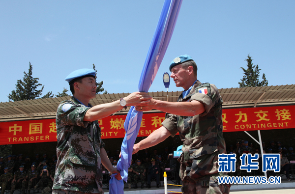 在黎巴嫩南部辛尼亞村的中國營舉行的中國赴黎維和部隊(duì)輪換交接儀式上,聯(lián)合國駐黎巴嫩臨時(shí)部隊(duì)(聯(lián)黎部隊(duì))參謀長皮埃爾(右)將聯(lián)合國旗交到中國第16批赴黎維和部隊(duì)指揮長黃云手中(5月22日攝)。新華社記者 李良勇 攝