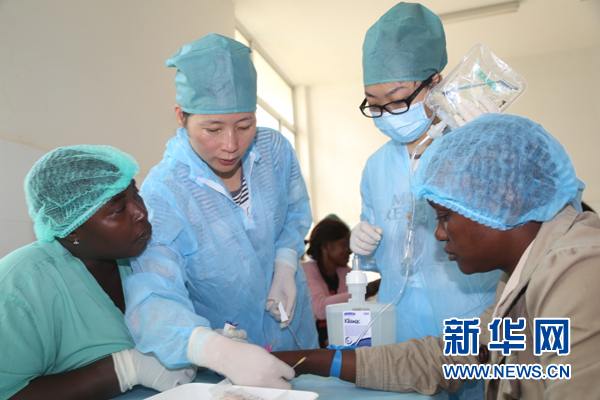 中國人民解放軍援助西非抗擊埃博拉疫情醫(yī)療隊(duì)為弗里敦中塞友好醫(yī)院開展輸液培訓(xùn)活動(dòng)(2014年12月10日攝)。新華社發(fā)(戴欣 攝)