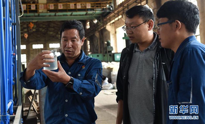 云南冶金昆明重工有限公司首席技師耿家盛(左)在車間里和助手查看生態(tài)環(huán)保廁所的沖水系統經過循環(huán)后的水質(9月22日攝)。新華社記者 藺以光 攝