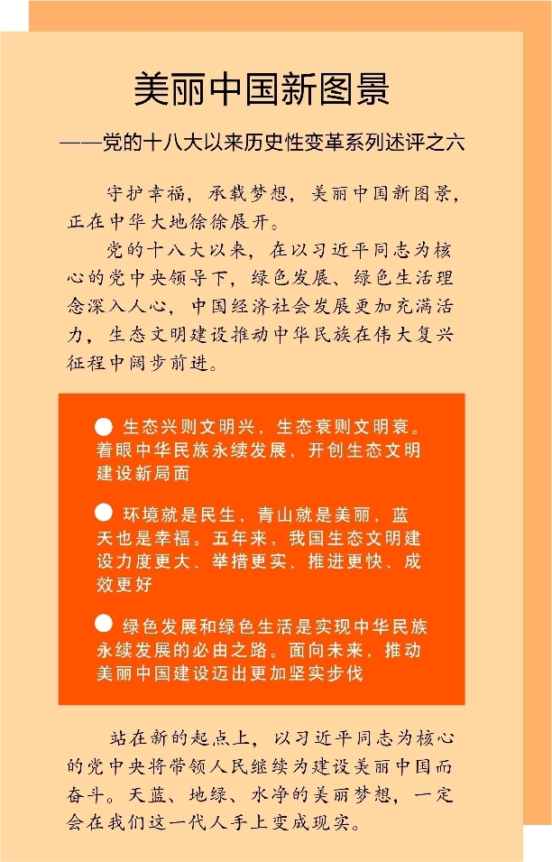 站在新的起點上,以習近平同志為核心的黨中央將帶領人民繼續(xù)為建設美麗中國而奮斗。天藍、地綠、水凈的美麗夢想,一定會在我們這一代人手上變成現(xiàn)實。