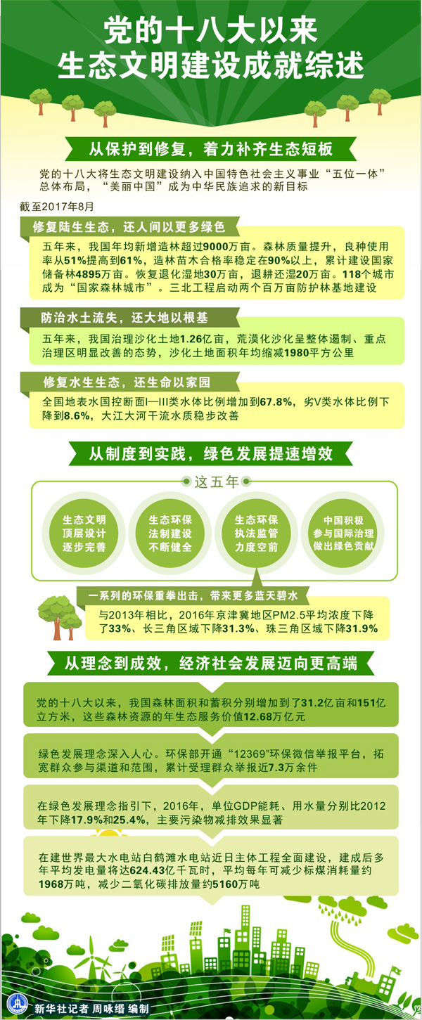 黨的十八大以來,在以習近平同志為核心的黨中央領導下,綠色發(fā)展、綠色生活理念深入人心,中國經濟社會發(fā)展更加充滿活力,生態(tài)文明建設推動中華民族在偉大復興征程中闊步前進。