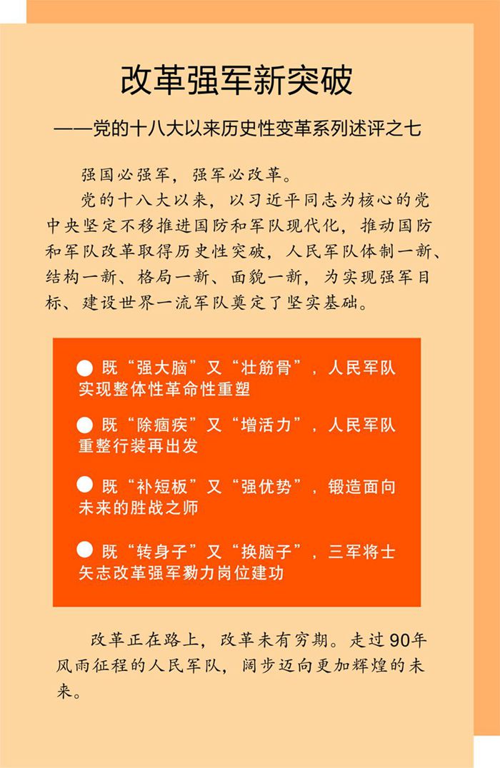 改革正在路上,改革未有窮期。走過(guò)90年風(fēng)雨征程的人民軍隊(duì),闊步邁向更加輝煌的未來(lái)。