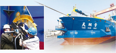 清晨。長(zhǎng)江口。“天鯤號(hào)”在淡淡的陽(yáng)光下,顏色格外鮮艷。