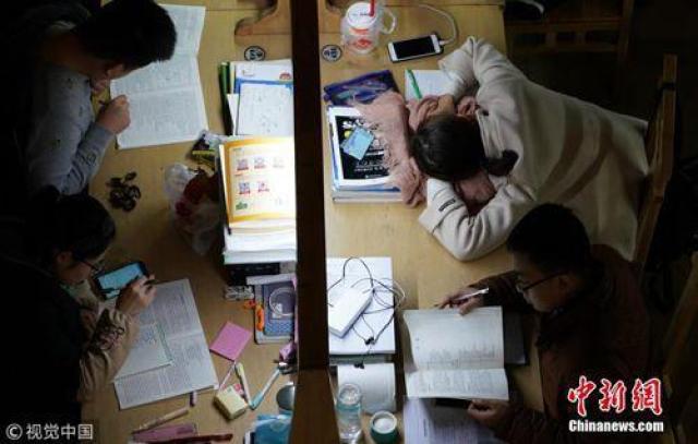 ↑近百名大學(xué)生在自習(xí)室內(nèi)備考。圖片來源:視覺中國