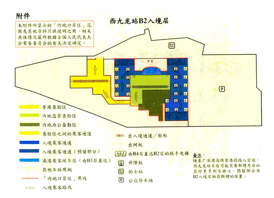 第二條 內(nèi)地口岸區(qū)的范圍為西九龍站地下二、三層的劃定區(qū)域、地下四層月臺(tái)區(qū)域及有關(guān)連接通道,包括內(nèi)地監(jiān)管查驗(yàn)區(qū)、辦公備勤區(qū)、離港乘客候車區(qū)、車站月臺(tái)和連接通道及電梯。內(nèi)地口岸區(qū)范圍的詳情見附件。