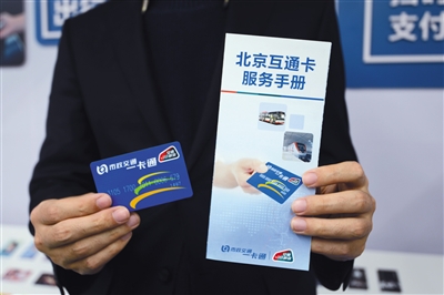 昨日,工作人員在展示京津冀互通卡。互通卡卡面右上角印有“交通聯(lián)合”標(biāo)識。 北京市政交通一卡通有限公司供圖