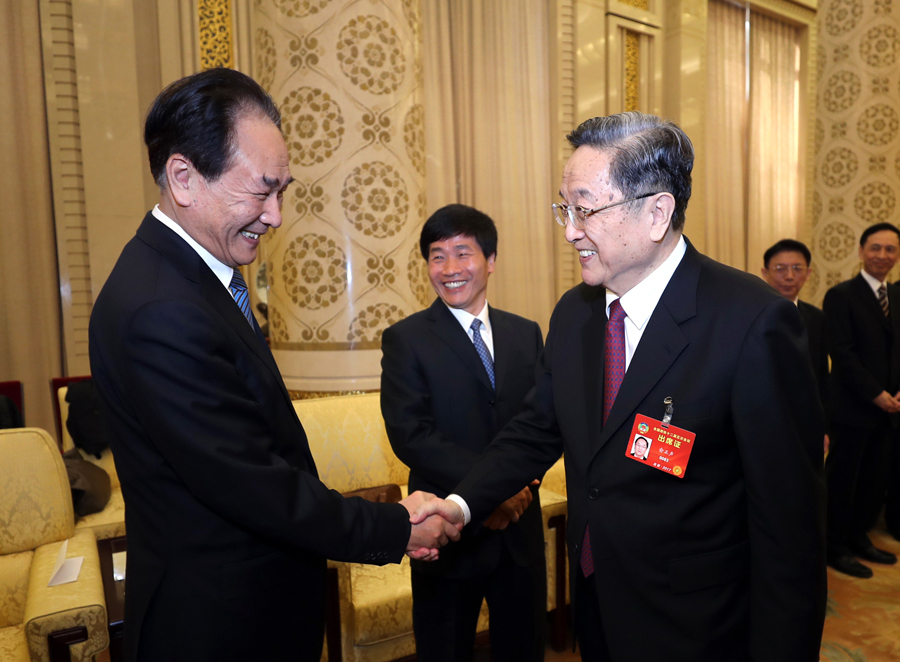 ?? 3月13日,中共中央政治局常委、全國政協(xié)主席俞正聲在北京人民大會堂看望參加全國政協(xié)十二屆五次會議新聞報道工作的中央主要新聞媒體負責同志和記者代表,向參加大會報道的新聞工作者表示誠摯慰問和衷心感謝。新華社記者 鞠鵬 攝