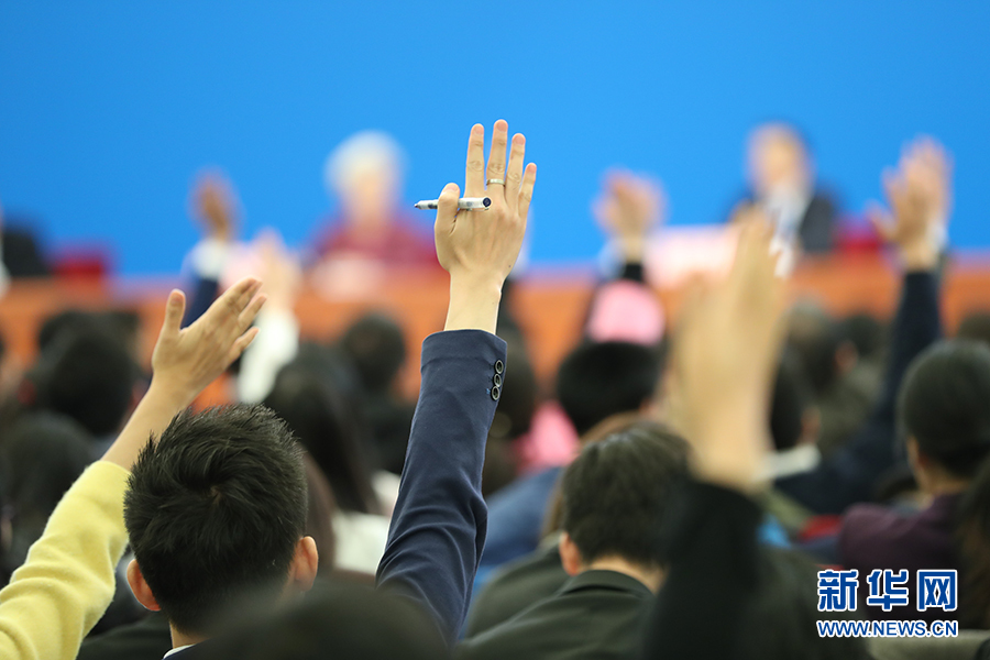 3月15日上午,國務(wù)院總理李克強在人民大會堂三樓金色大廳會見采訪十二屆全國人大五次會議的中外記者并回答記者提出的問題。圖為記者踴躍提問。新華網(wǎng)/中國政府網(wǎng)?孫韜 攝?