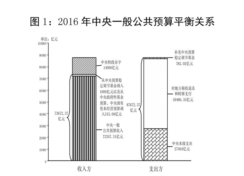 中央一般公共預算收入72357.31億元,為調整預算的100%,比2015年同口徑增長1.2%。加上從中央預算穩(wěn)定調節(jié)基金調入1000億元,從中央政府性基金預算、中央國有資本經營預算調入315.06億元,收入總量為73672.37億元。中央一般公共預算支出86890.35億元(其中,中央本級支出27404億元,中央對地方稅收返還和轉移支付59486.35億元),完成調整預算的99.1%,增長4.5%。加上補充中央預算穩(wěn)定調節(jié)基金782.02億元,支出總量為87672.37億元。收支總量相抵,中央財政赤字14000億元,與預算持平。2016年中央預備費預算500億元,實際支出146.1億元,剩余353.9億元全部轉入中央預算穩(wěn)定調節(jié)基金。2016年末,中央財政國債余額120066.75億元,控制在年度預算限額125908.35億元以內;中央預算穩(wěn)定調節(jié)基金余額2678.06億元(含通過收回中央財政結轉資金補充1501.83億元)。