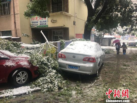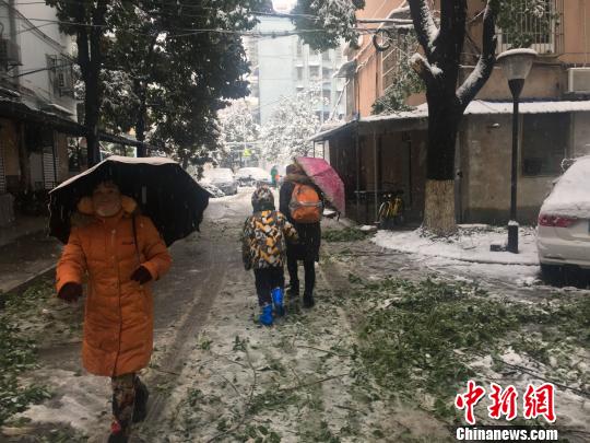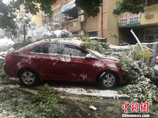 合肥一小區(qū)內(nèi),樹(shù)枝被積雪壓斷,砸在路邊??康能囕v上?!≮w強(qiáng) 攝