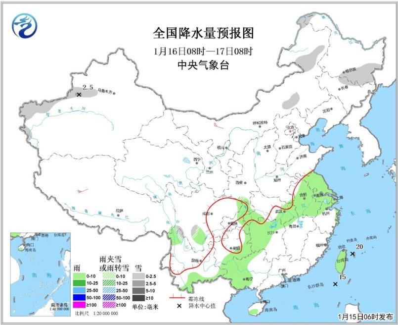 全國(guó)降水量預(yù)報(bào)圖(1月15日08時(shí)-16日08時(shí))