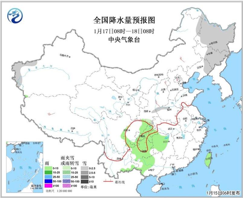 全國(guó)降水量預(yù)報(bào)圖(1月17日08時(shí)-18日08時(shí))