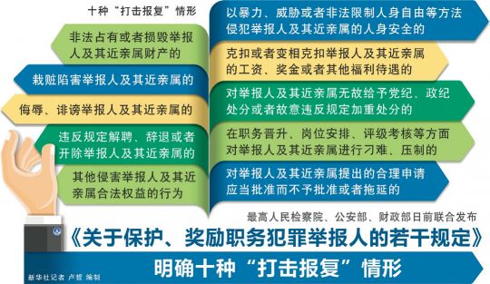 “舉報(bào)人的舉報(bào)行為可能會(huì)使違法者面臨較大數(shù)額的罰金甚至刑事處罰,因此,被舉報(bào)者可能會(huì)對(duì)舉報(bào)人及其家人進(jìn)行或明或暗的報(bào)復(fù)?!倍帕⒃f。內(nèi)部舉報(bào)人往往是企事業(yè)單位職工、公務(wù)員等,如果保護(hù)機(jī)制不健全,就可能遭遇調(diào)換崗位等隱性報(bào)復(fù)行為。舉報(bào)人如何尋找申訴部門、如何對(duì)遭到打擊報(bào)復(fù)的舉報(bào)人進(jìn)行救濟(jì)等,都是亟需解決的問題。
