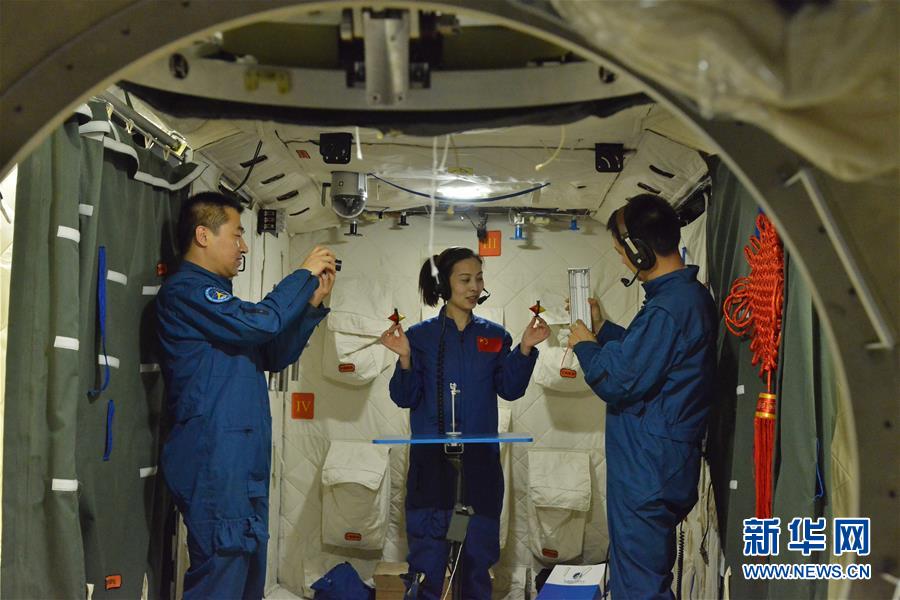 2013年5月22日,航天員王亞平(中)、聶海勝(右)、張曉光在模擬天宮一號組合體內(nèi)進(jìn)行太空授課訓(xùn)練。新華社發(fā)(朱九通 攝)