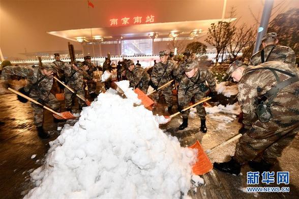 1月5日,東部戰(zhàn)區(qū)陸軍“臨汾旅”官兵在南京南站北廣場(chǎng)掃雪除冰。新華社發(fā)(于同化 攝)