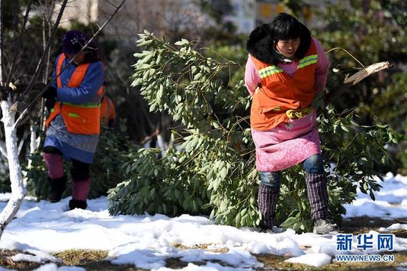 1月11日,持續(xù)大雪將合肥很多城市綠化樹(shù)木壓折,幾名綠化工人在清理折斷的樹(shù)枝。新華社記者劉軍喜攝