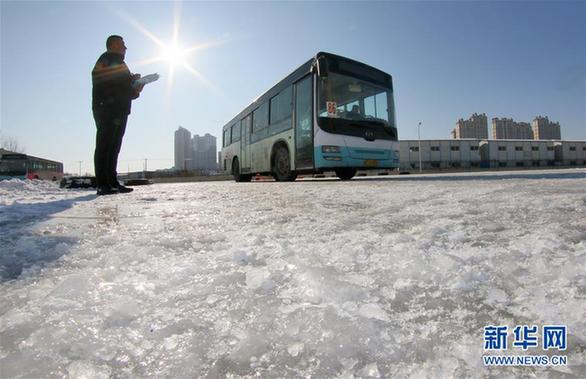 1月12日,在山東煙臺(tái)孫家灘公交場(chǎng)站,工作人員考核駕駛員冰雪路面駕駛技能。新華社發(fā)(唐克 攝)
