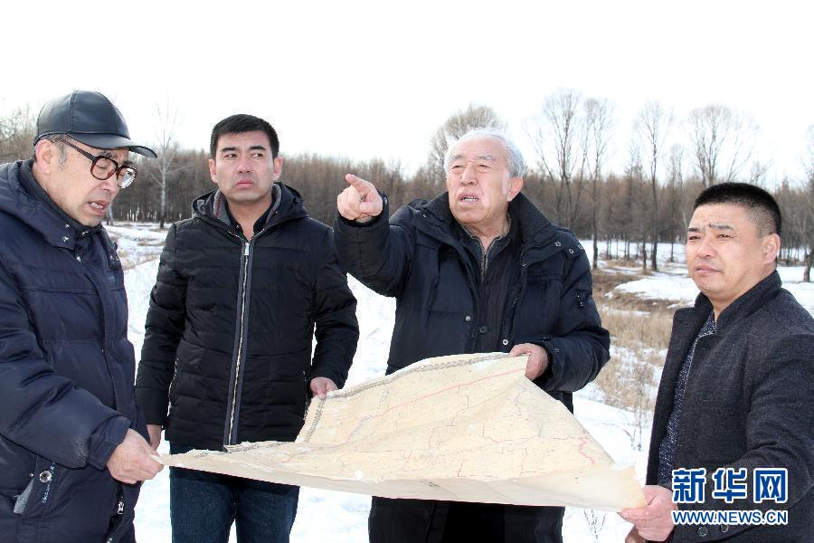 2016年3月14日,王樹清(右二)在黑龍江省拜泉縣國(guó)富鎮(zhèn)通肯村和當(dāng)?shù)馗刹恳?guī)劃植樹造林。新華社發(fā)