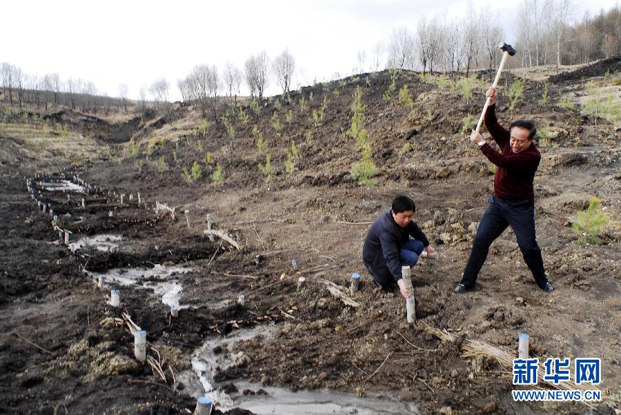 2009年11月30日,在黑龍江省齊齊哈爾市拜泉縣,王樹清(左)在檢查樹苗情況。新華社發(fā)
