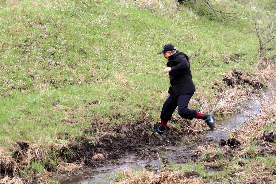 2016年5月25日,王樹清在黑龍江省拜泉縣國(guó)富鎮(zhèn)愛護(hù)村查看造林地塊時(shí)跳過(guò)一條水溝。新華社發(fā)