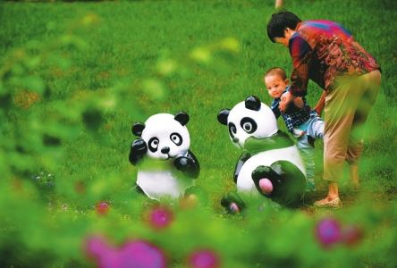 2月3日,冬日的陽(yáng)光明艷無(wú)比,成都三環(huán)路嬌子立交至航天立交外側(cè),濃密的樹(shù)叢里,一條灰磚小道在草地里蜿蜒。周圍散落的是各種熊貓的雕塑,有彩色的,也有用植物打造的。