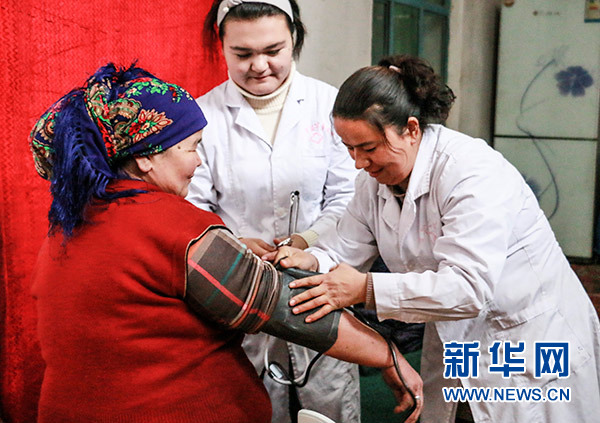 新疆喀什市浩罕鄉(xiāng)庫恰比西村衛(wèi)生所醫(yī)務(wù)人員在為村民測量血壓(2017年12月19日攝)。新華社記者 郝玉 攝