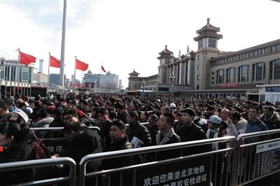 昨天上午10點(diǎn)半,地鐵北京站D口外立起了多條鐵柵欄,將長(zhǎng)達(dá)百米的等待隊(duì)伍分成了四列。記者從中國(guó)鐵路總公司獲悉,2月20日,鐵路春運(yùn)迎來返程客流高峰,全國(guó)鐵路預(yù)計(jì)發(fā)送旅客1060萬(wàn)人次,同比增長(zhǎng)8.3%。