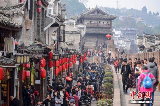 2月17日,正值農(nóng)歷大年初二,湖南鳳凰古城內(nèi)人頭攢動(dòng),眾多海內(nèi)外游客選擇來到鳳凰古城感受新春年味。 楊華峰 攝