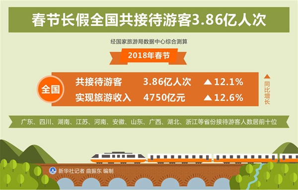 經國家旅游局數據中心綜合測算,今年春節(jié)全國共接待游客3.86億人次,同比增長12.1%,實現旅游收入4750億元,同比增長12.6%。