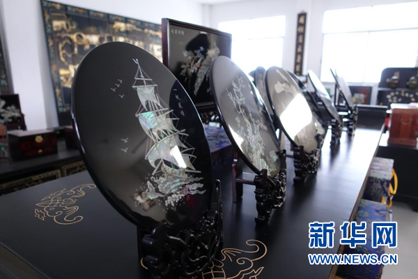 徽漆展廳里陳列的徽漆貝殼畫(huà)作品。新華網(wǎng) 卓越 攝