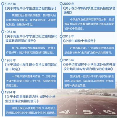 為什么會(huì)這樣?其實(shí),自1955年7月教育部發(fā)出新中國(guó)第一個(gè)“減負(fù)令”——《關(guān)于減輕中小學(xué)生過重負(fù)擔(dān)的指示》以來,60余年間我國(guó)中央及地方相關(guān)部門出臺(tái)的學(xué)生“減負(fù)令”多達(dá)上百道,圍繞學(xué)習(xí)時(shí)間、考核方式、教材內(nèi)容、課外活動(dòng)、教師水平、學(xué)校領(lǐng)導(dǎo)等方面做出了一系列細(xì)致嚴(yán)謹(jǐn)?shù)囊?guī)定。