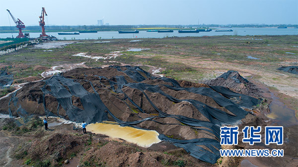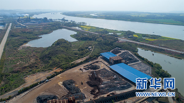 這是3月29日用無人機拍攝的安徽貴池前江工業(yè)園內(nèi)池州恒鑫材料科技有限公司廠區(qū)內(nèi)的長江堤岸旁傾倒的選礦尾渣。新華社記者 郭晨 攝