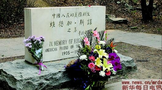 四月的北京大學(xué)未名湖畔,一片春意盎然。湖畔小路南側(cè)的斯諾墓前,整齊擺放著幾束鮮花,最外面的那束尤為新鮮。北京大學(xué)元培學(xué)院黨委書記、中國埃德加·斯諾研究中心主任孫華說,這是中安賓館的全體黨員來給斯諾先生掃墓留下的,中安賓館的原址是斯諾夫婦上世紀30年代在北京時的居住地。