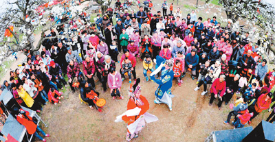 4月7日,安徽碭山縣迎來百萬畝梨花盛開,當(dāng)?shù)乩孓r(nóng)組織吹嗩吶、唱大戲、斗羊等傳統(tǒng)民俗表演,祈盼酥梨豐收。韓俊杰 王嫣 攝影報道