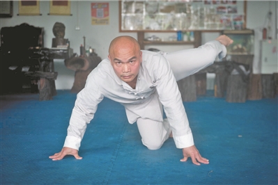 黎偉軍最令人驚嘆的,莫過于他的硬氣功,在2017年他就有兩次面對公眾的驚艷表現(xiàn)。3月,他在高明世紀廣場用48.06秒劈碎了150只椰子。11月,僅僅用時55秒87,302顆核桃就被黎偉軍打成一地碎屑。另外,“人體旗幟”也是黎偉軍的拿手好戲。在記者的邀請下,今年已經(jīng)46歲的黎偉軍脫下上衣活動手腳。一聲吼叫之后,他一個箭步跨上道具,雙手上下支撐在鐵桿上,瞬間雙腿離地就像懸掛在空中的旗幟,身體幾成一條直線。黎偉軍堅持了10多秒,而且凌空的腿還能彎曲做出踢腿等動作,輕松自如,“我最長的一次堅持了38秒”。