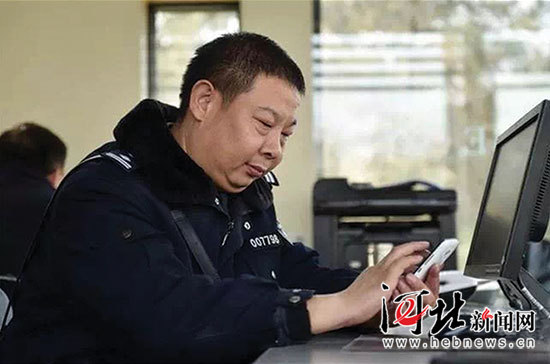 呂建江在工作中利用微博微信回復(fù)網(wǎng)友提問。記者田明、史晟全攝影報(bào)道(資料照片由河北省公安廳新聞中心、石家莊市公安局橋西分局提供)