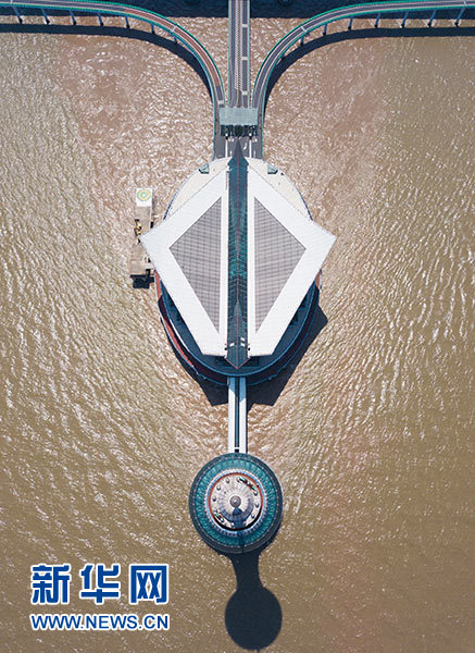 鳥瞰杭州灣跨海大橋海上觀光服務(wù)平臺(4月19日無人機航拍)。新華社記者 翁忻旸 攝