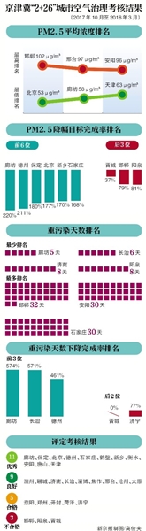 評估結(jié)果顯示,2017年10月至2018年3月,“2+26”城市PM2.5平均濃度最低的3個城市依次是北京、廊坊和天津;濃度最高的3個城市依次是邯鄲、邢臺和安陽。