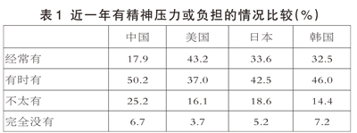 由表1的數(shù)據(jù)可見,近一年,17.9%的中國高中生經(jīng)常感到有精神壓力或負(fù)擔(dān),50.2%有時(shí)有,合計(jì)68.1%的中國高中生有精神壓力或負(fù)擔(dān),在四國中比例最低。壓力感最大的是美國高中生,其次是韓國和日本。6.7%的中國高中生完全沒有精神壓力或負(fù)擔(dān),僅比韓國少0.5個(gè)百分點(diǎn),比日本和美國高中生分別多1.5和3.0個(gè)百分點(diǎn)。