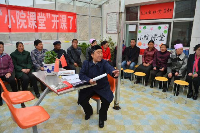新村沒有專門的黨支部活動地點,馬奶奶就把自己家變成黨支部。2017年8月份,黨的十九大召開前,馬奶奶在自己家二樓收拾出一間玻璃房,起名叫“小院課堂”。8月份的一個早上,“小院課堂”的第一節(jié)黨課正式開講了。