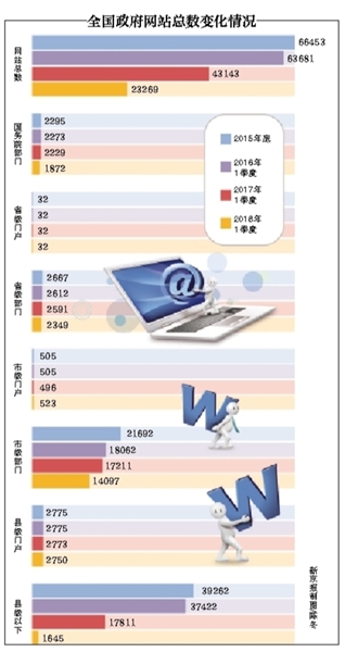 通報顯示,截至2018年3月1日,全國正在運行的政府網(wǎng)站23269家,其中,國務院部門及其內(nèi)設(shè)、垂直管理機構(gòu)政府網(wǎng)站1872家,省級政府門戶網(wǎng)站32家,省級政府部門網(wǎng)站2349家,市級政府門戶網(wǎng)站523家,市級政府部門網(wǎng)站14097家,縣級政府門戶網(wǎng)站2750家,縣級以下政府網(wǎng)站1645家。