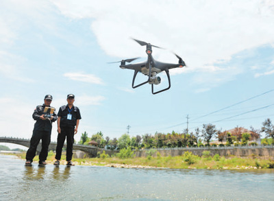 5月17日,浙江省杭州市臨安區(qū)天目山鎮(zhèn),河道管護隊員在操作無人機巡河。胡劍歡攝(人民視覺)