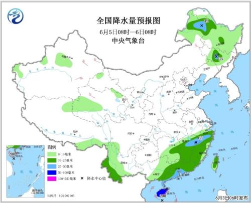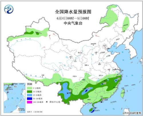全國(guó)降水量預(yù)報(bào)圖(6月3日08時(shí)-4日08時(shí))